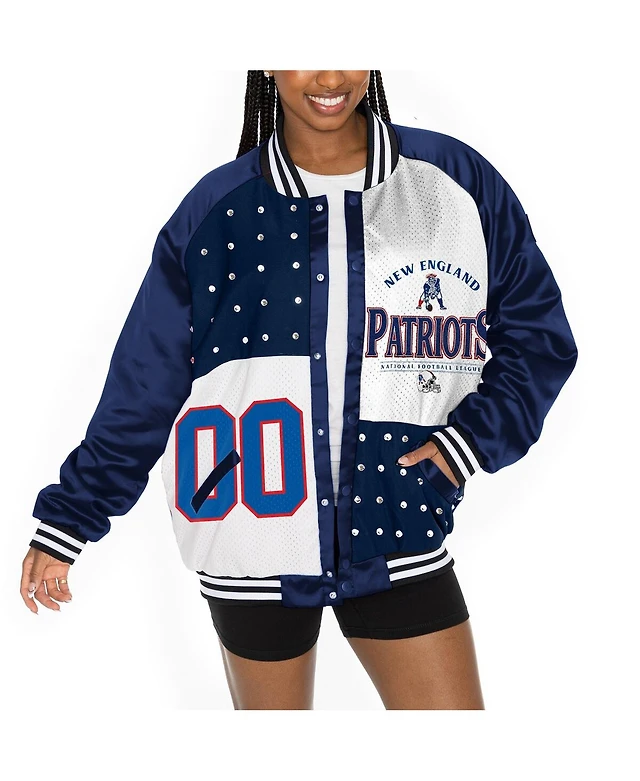 Gameday Couture Women's Navy/White New England Patriots Oversized Hot Shot Rhinestone Throwback Full-Snap Varsity Bomber Jacket