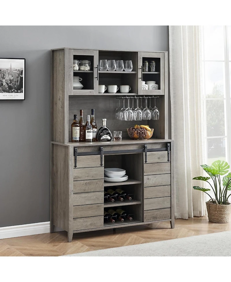 This farmhouse bar cabinet features an upper hutch with 2 open shelves, 4 glass-door shelves, and 12-16 removable stemware slots, plus a spacious 15.7"D x 47.2"W countertop. The bottom buffet includes 2 sliding barn doors, 7 adjustable shelves, and a removable 6-bottle wine rack, offering flexible storage for items of varying heights. The premium metal sliding door system provides easy, noise-free access while saving space, creating 3 open and 4 hidden storage areas. Additional features include a 4-row removable glass holder for easy display and access to glassware, a large cable hole in the backboard for tidy appliance wiring, and a sturdy support base with a 3.1" thick wooden platform and adjustable metal middle support leg for stability on uneven floors. This versatile cabinet combines farmhouse charm with practical design for all your storage and entertaining needs.