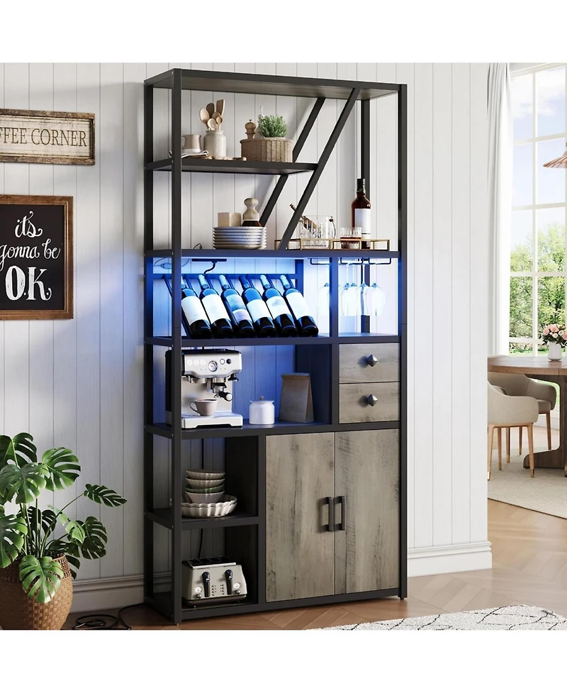 gaomon Bar Cabinet with Led Lights, Tall Coffee Bar Station with Power Outlets and Storage Rack, Grey