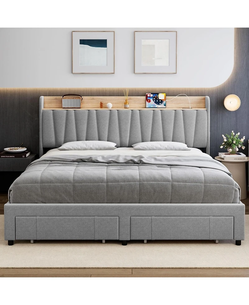 gaomon Bed Frame Storage Headboard Upholstered Platform Drawers Charging Station Noise-Free Easy Assembly No Box Spring.