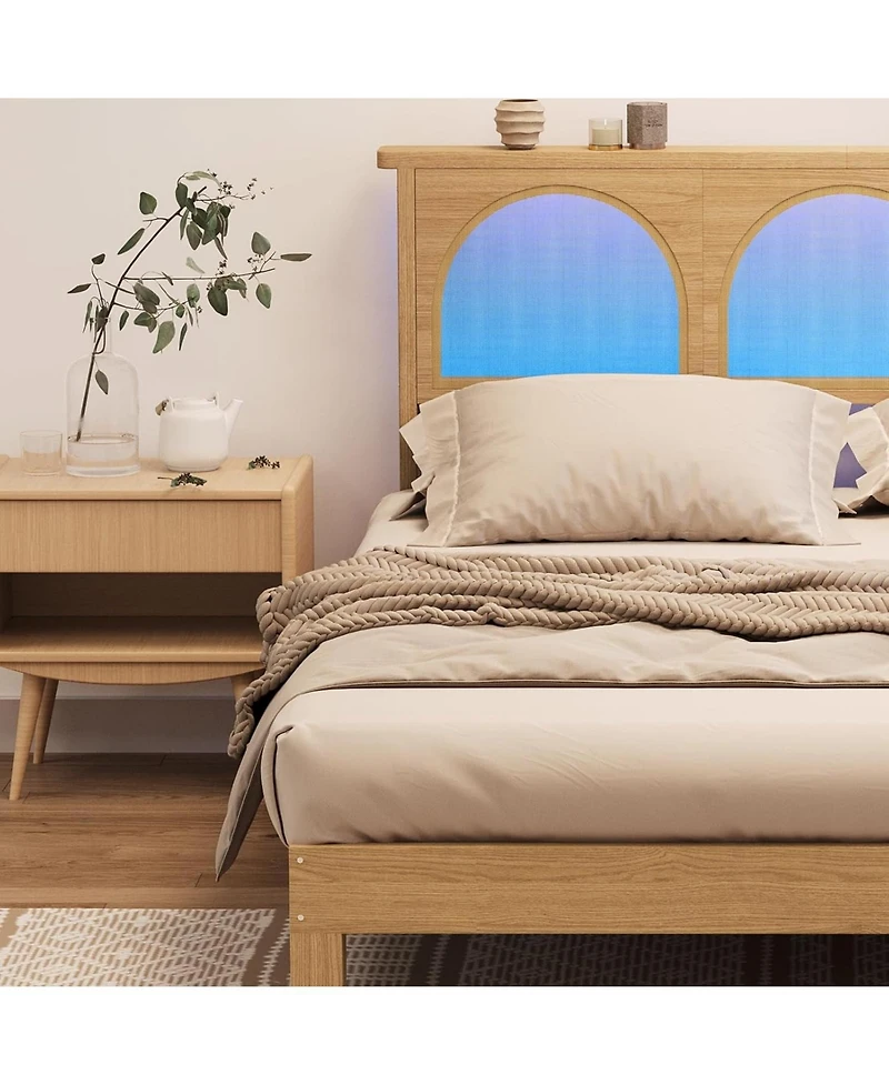 gaomon Boho Rattan Bed Frame Wood Platform Smart Rgb Led Rattan Headboard Under Storage No Box Spring Easy Assembly