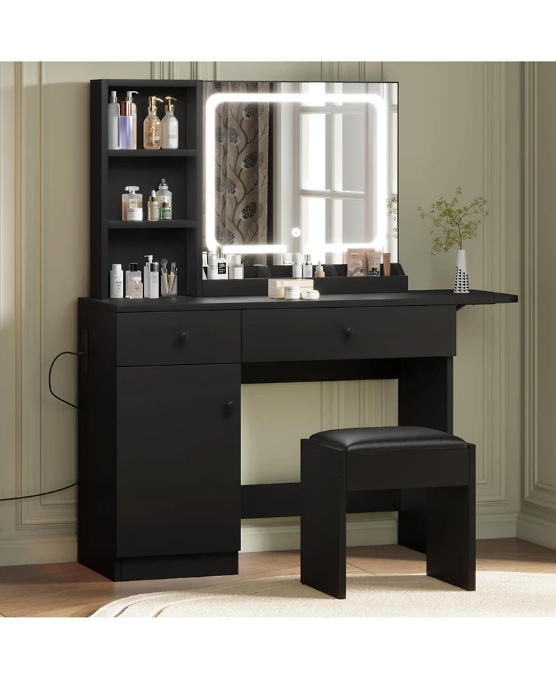 Upgrade your bedroom with this incredibly chic and highly functional makeup vanity table set. Featuring a brilliantly clear mirror surrounded by powerful lights, it guarantees you have the exceptional illumination required for a flawless daily beauty routine. The desk's sleek, contemporary design provides ample surface area and hidden storage space to keep your essential cosmetics perfectly organized and within arm's reach. Easy to assemble and built to last, it is the perfect glamorous addition to any apartment or home.