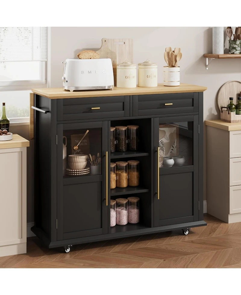 Smart Storage Islands: This 41"x16" rustic kitchen island combines 2 cabinets, 2 drawers, and 3 shelves with a fold-out extension board (adds 12" workspace) and towel bar—crafted from wood for durable, timeless charm. This kitchen island with storage keeps all your cooking essentials neatly organized and within easy reach