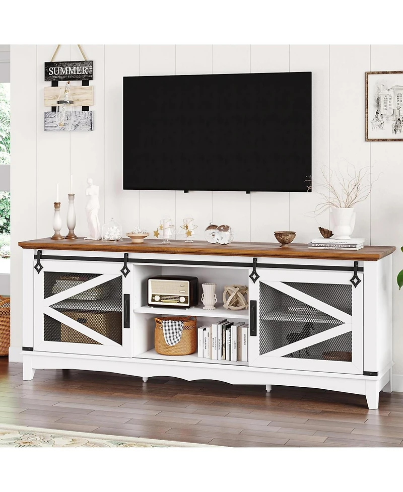 This farmhouse-style Tv stand is designed to maximize your living room storage with its spacious 66"D x 15.7"W x 28"H frame, perfect for TVs up to 75 inches. It features three lower storage compartments, each measuring 20.9" long and 13
