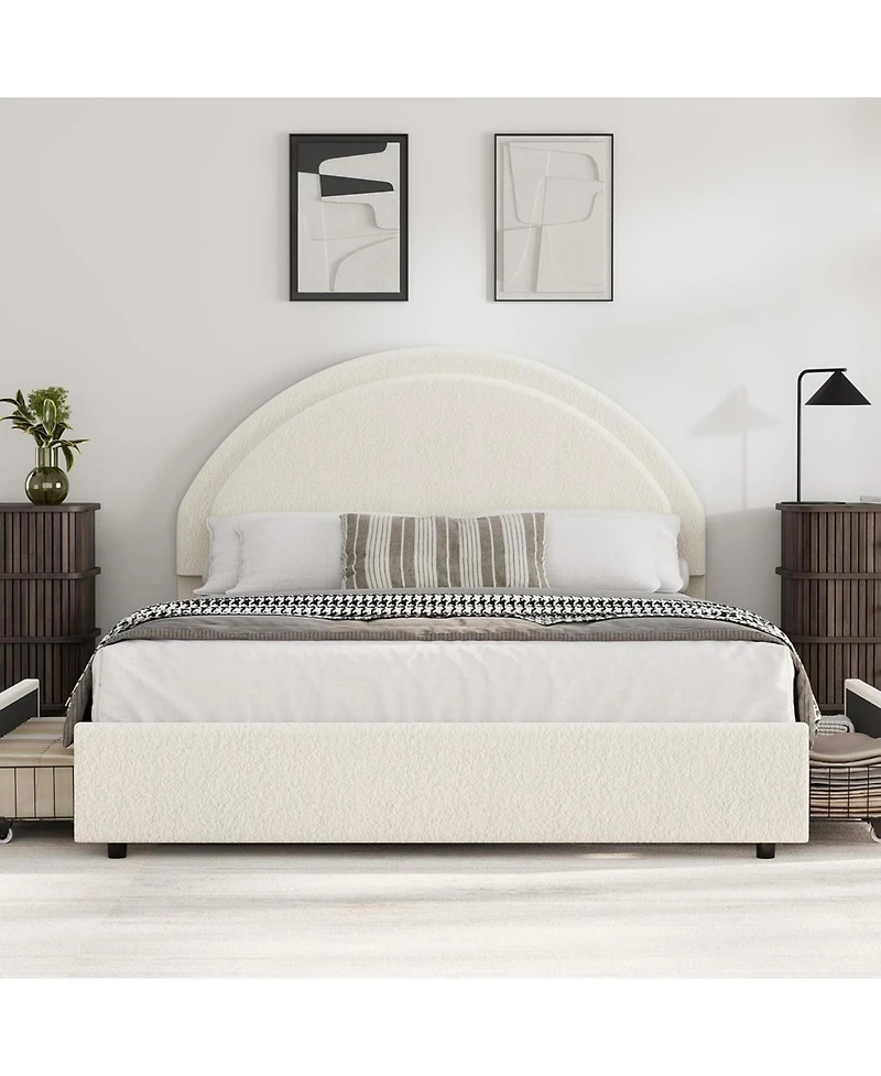 Modern Round Headboard Design: The bed frame features an elegant arc round shape headboard, adding a smooth and comfortable linear beauty, moving away from the harshness of traditional square edges, dding a touch of sophisticated elegance to your bedroom.Boucle Fabric Bed Frame: Fully wrapped in premium, textured boucle fabric that is incredibly soft and warm, bringing a cloud-like enveloping feeling, while enhancing durability and breathability.2 Flexible Large Drawers: The upholstered bed frame comes with four spacious storage drawers underneath for blankets, seasonal clothes, or toys, it maximizes room efficiency in smaller bedrooms. Each drawer has four smooth wheels that make them easy to pull in and out. They can be positioned in any of the four locations underneath, offering flexible storage solutions tailored.Rock-Solid Stability: Features a reinforced metal frame and selected metal hardware for durability. Supported by multiple solid wood slat