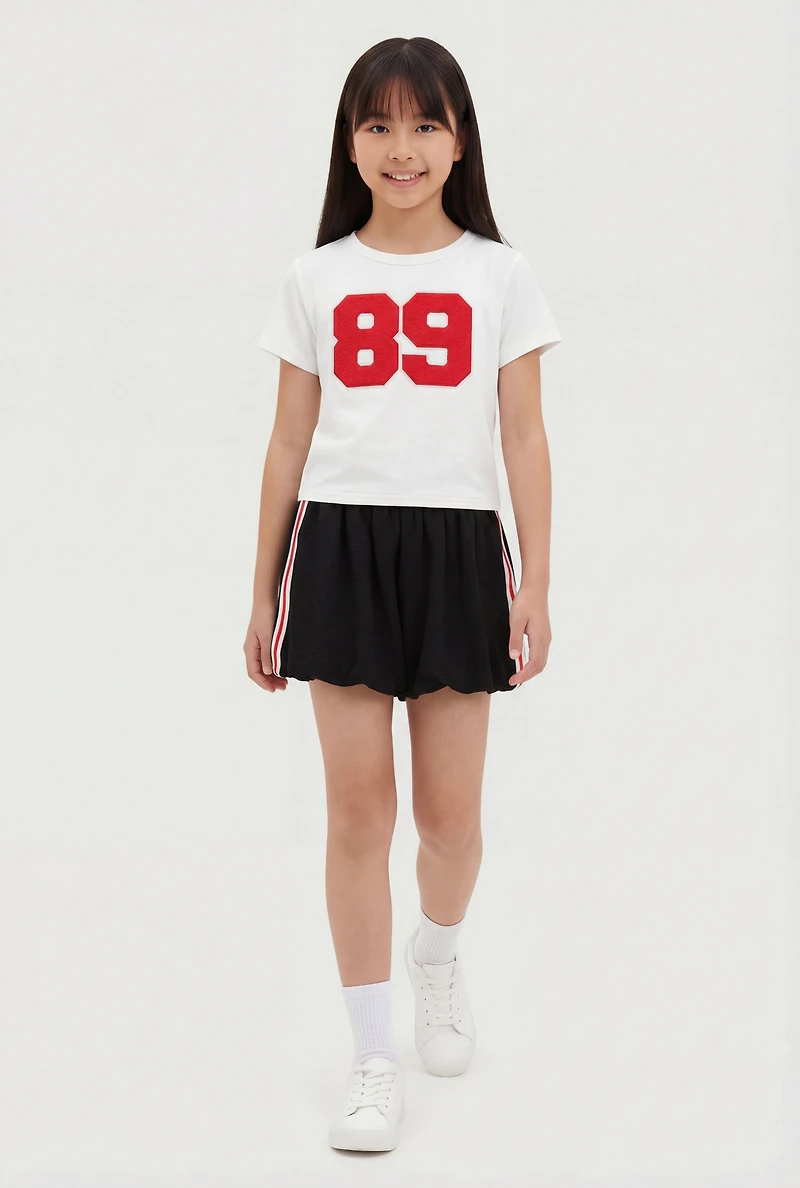 Score major style points with this Girls 89 Graphic Patch Tee and Varsity Bubble Skort set. Designed for everyday fun, this casual two-piece features a comfy crepe knit tee with a cool 89 graphic patch and a sporty varsity bubble skort that moves with her. The mid-rise fit and crew neck keep it easy and breezy, perfect for playdates or chill days. Varsity stripes and embroidered patches add a trendy touch that’s totally on point for young fashion lovers.