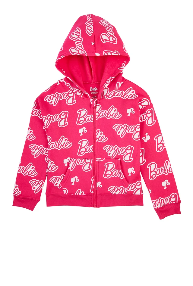 Girls Barbie Graphic Print Zip Front Hoodie, Pink, Size 8