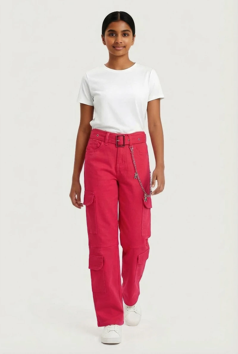 Girls Belted Utility Jeans with Bear Chain, Pink,
