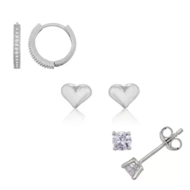 Silver Treasures Womens Cubic Zirconia Sterling Silver Heart 3 Pair Earring Set