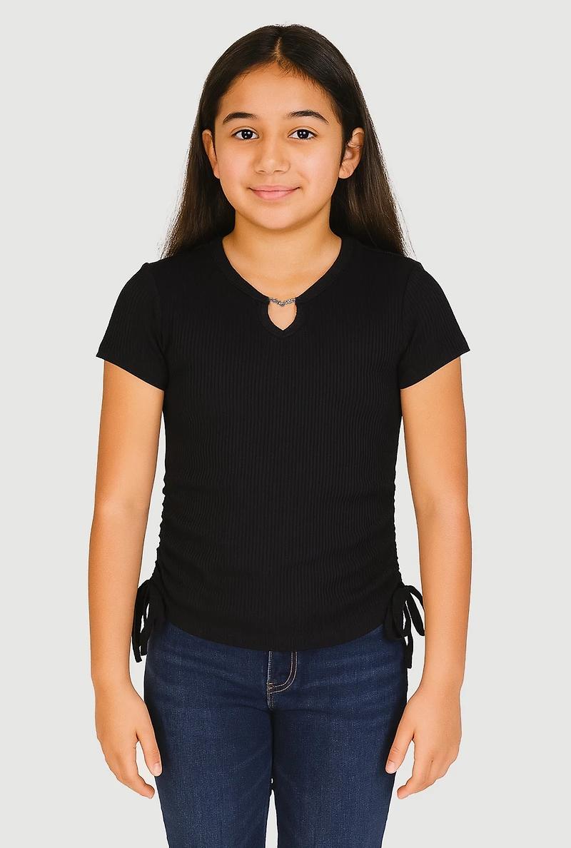 Girls Ribbed Knit Heart Keyhole T Shirt
