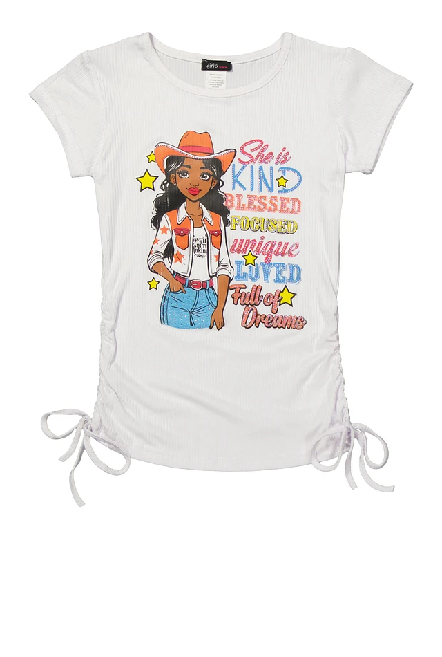 Girls She Is Kind Cowgirl Graphic Ruched Top, White, Size 10-12