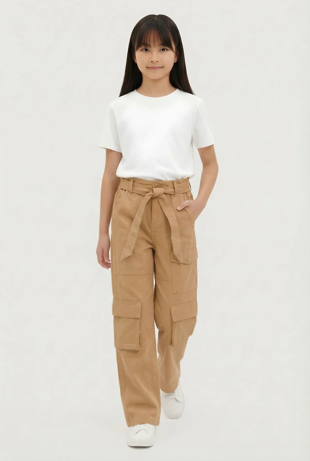 Girls Twill Cargo Joggers with Tie Waist Belt,