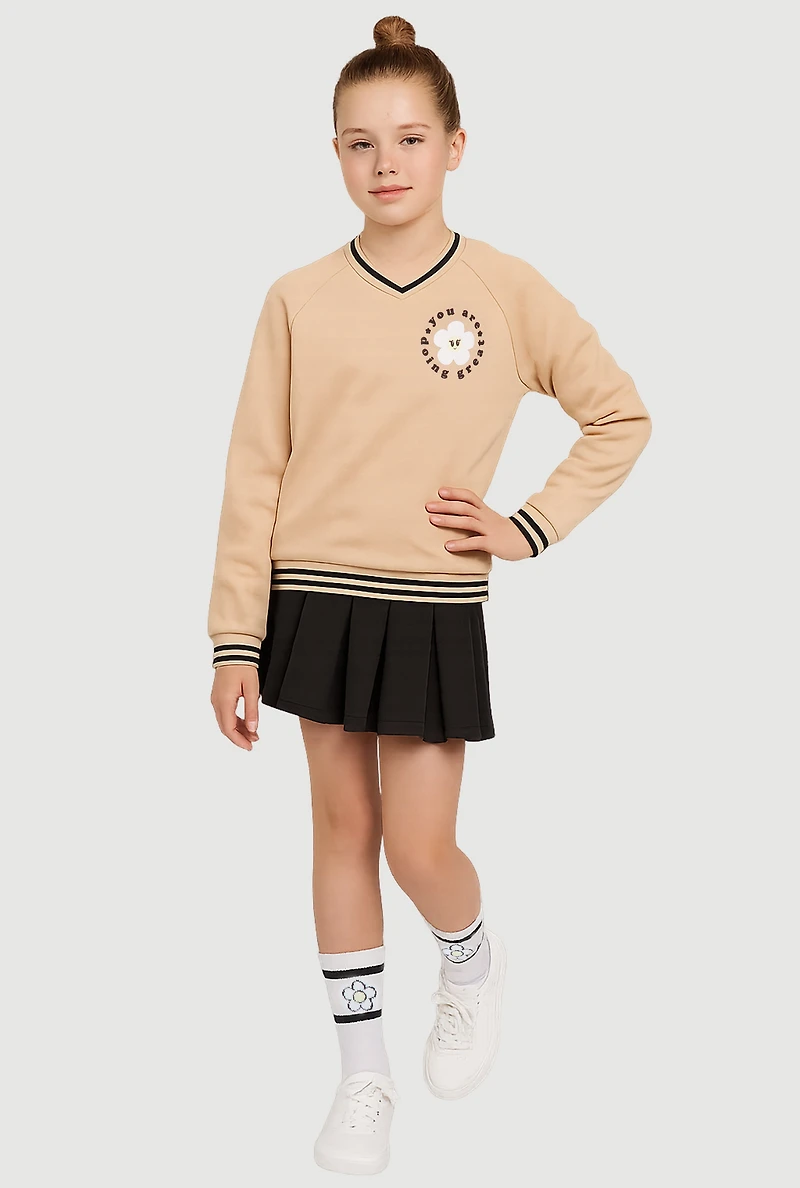 Boost her confidence and style with this adorable 3-piece set designed just for girls who are doing great every day. Featuring a cozy fleece sweatshirt with an encouraging "you are doing great" graphic and a chic mid-length pleated skirt with varsity stripe details, this outfit is perfect for back to school or casual hangouts. Plus, it includes matching xs socks to complete the look. Comfort meets cuteness in a set thats as motivational as it is fashionable. 3-piece set includes sweatshirt, a pleated skirt, and socks soft fleece material for all-day comfort long-sleeved sweatshirt with uplifting graphic print mid-rise, mid-length pleated skirt with varsity stripe detail for a trendy vibe v-neckline adds a stylish touch perfect casual outfit for back to school or everyday wear includes xs size socks for a complete coordinated look content and care material: top: 100% polyester, bottom: 95% polyester, 5% spandex care instructions: machine wash, tumble dry country of origin: bangladesh rainbow item number 3608062700002 khaki - 3608062700002025