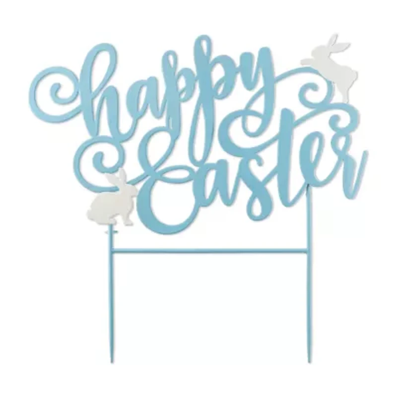This 24"L Metal Blue Yard Stake showcases the phrase "Happy Easter" in a stylish blue cursive font. It also features two white bunny silhouettes, making it a charming and festive addition to your Easter yard decor.