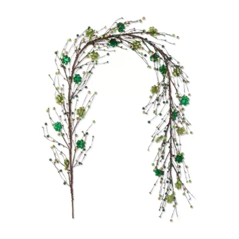 Glitzhome 72"L St. Patrick's Garland features twisted branches adorned with green shamrocks, gold beads, and small green berries. It's perfect to bring a festive Irish touch to your home decor.