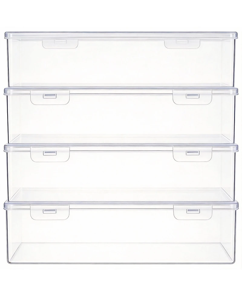 Four-piece clear storage set made of sturdy, Pp plastic each box holds 1.3 qt, perfect for pens, brushes, and small tools. Transparent walls show contents at a glance, tight lids keep dust out, and the bins stack securely to save space. Use them for art, office, craft, cosmetic, or even dry-food storage they wipe clean in seconds. weight: 1.8 pounds. 11.81""L x 4""W x 2.8""H