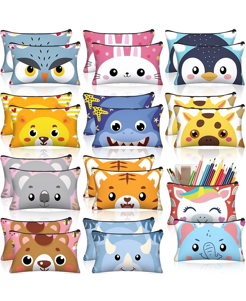 The package includes 24 animal pencil cases in 12 different designs, 2 pieces per style, featuring cute patterns such as bear, cat, bunny, penguin, shark and pig with abstract art print. Each pencil case measures 7.87 x 4.72 inches, compact and lightweight for easy carrying in hand or bag. Designed with zipper closure for convenient access to stationery and preventing loss of items. Suitable for daily office use and work, serving as practical gifts to inspire learning interest.