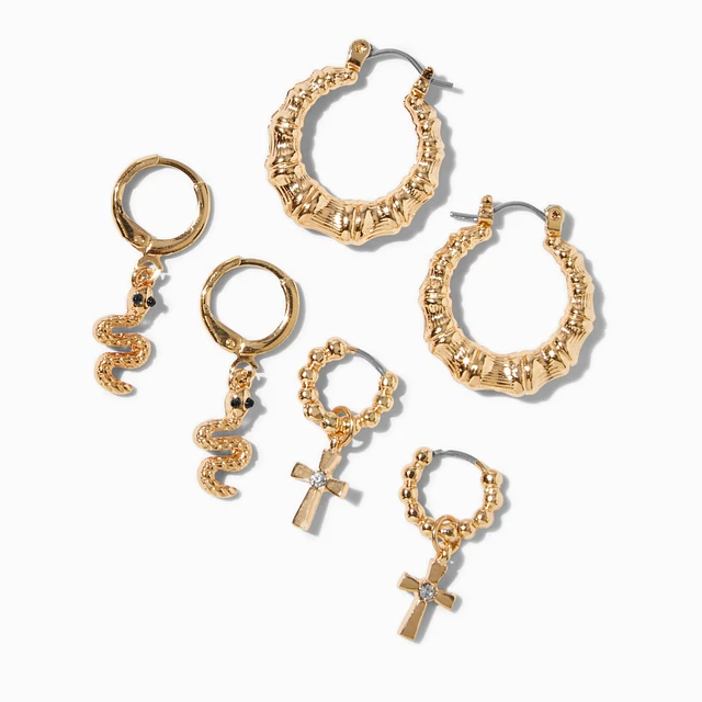 Gold-tone Bamboo Cross Snake Hoop Earring Stackables Set - 3 Pack