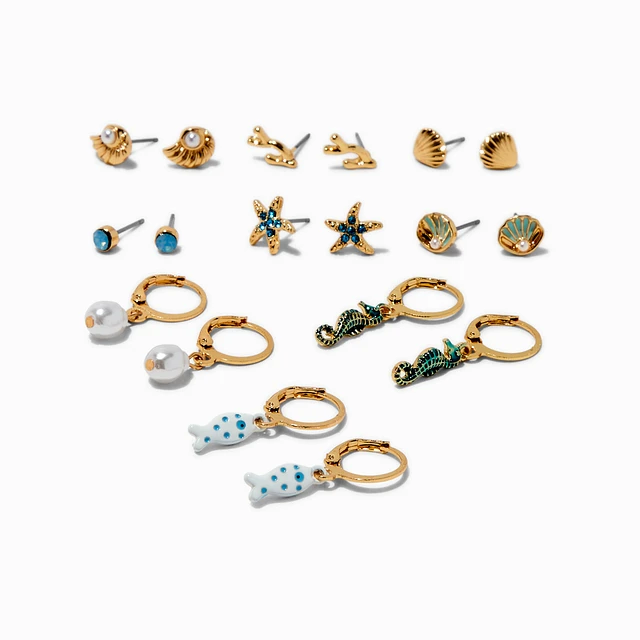 Gold-tone Beach Stud & Hoop Earrings - 9 Pack