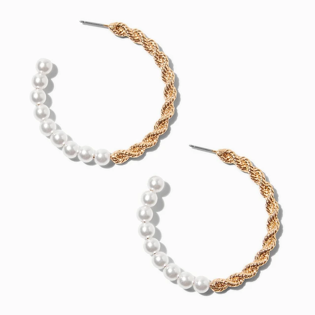 Gold-tone Twisted Pearl 50mm Hoop Earrings