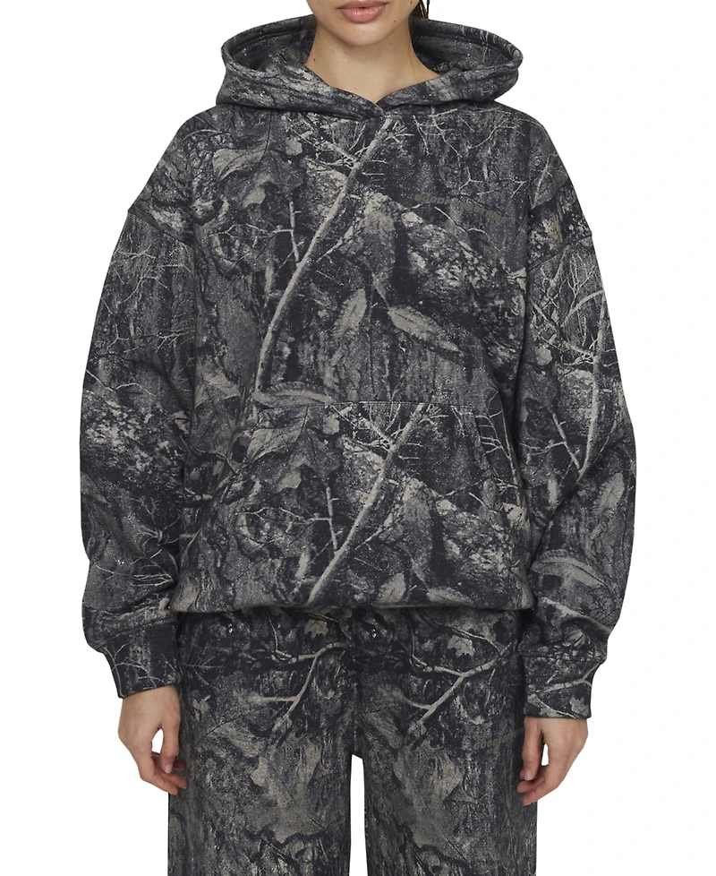 Embrace style with the Woodland Blackout Camo Relaxed Hoodie. Designed for women, this soft hoodie features a relaxed fit and an all over camo print. Perfect for casual outings or lounging at home, its cozy fabric and sleek puff print logo ensures you stay snug and chic all day long. Elevate your wardrobe with this timeless piece.