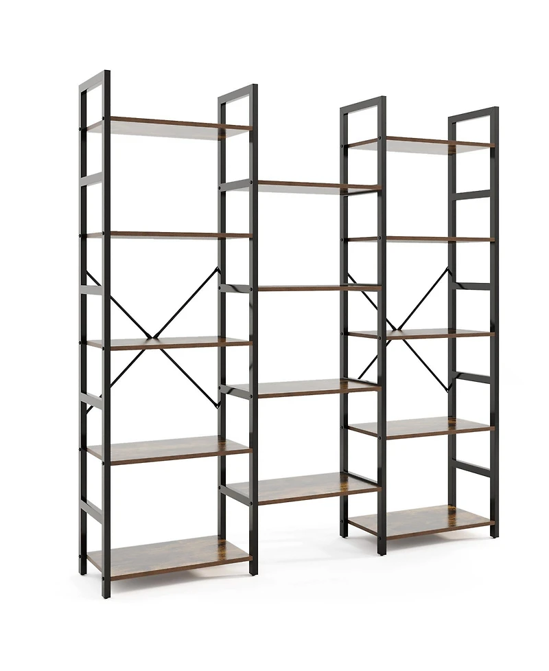 Anchor a home office or living room wall with this triple-wide industrial bookshelf spanning 68 in and offering 14 open shelves for books, binders, and displays. A heavy-duty metal frame with X-reinforcement bars supports a combined 930 lbs, while eight adjustable foot pads keep it level on uneven surfaces. Two anti-toppling devices add safety, and rustic wood-grain shelves pair with dark metal for an industrial look.