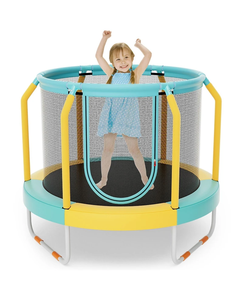 This kids' trampoline features an innovative safety design with 4"" distance between the net and poles, and seamless construction to prevent injuries. The durable, breathable jumping mat and elastic bungees ensure hours of fun. Stable with U-shaped legs, it's easy to assemble and promotes physical activity for kids.