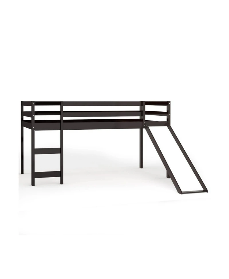 Turn bedtime into an adventure with this twin low loft bed featuring an integrated slide and ladders on both sides. Solid pine and P2 chipboard construction supports up to 175 lbs at a low, child-safe platform height. Eight wooden slats provide even mattress support, and two metal brackets add reinforcement. Rounded poles and full guardrails protect the sleeping area, while open space below is perfect for a play zone or toy storage.