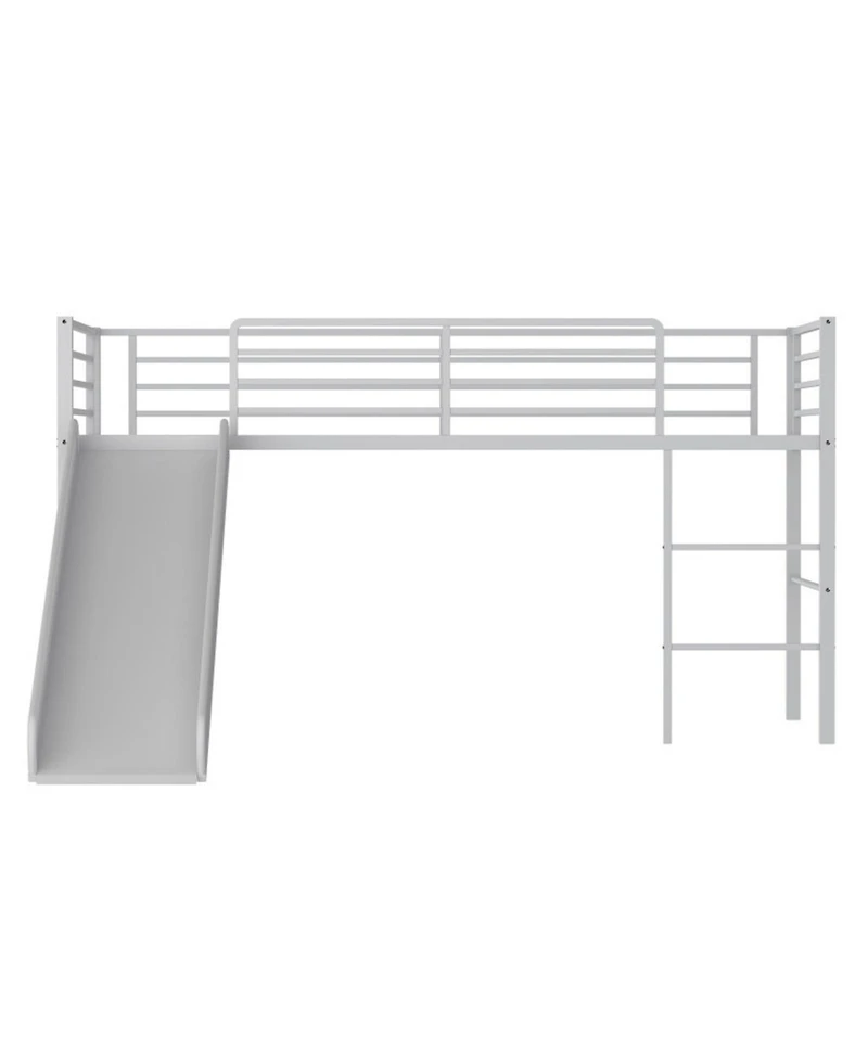 Turn any kids room into an exciting retreat with this silver steel loft bed featuring a built-in slide and integrated three-step ladder. The platform sits 29.5 in above the floor, leaving ample space below for a play area or toy storage. Full-perimeter 12 in guardrails keep young sleepers secure, and the heavy-duty steel frame supports up to 330 lbs. No box spring is needed, and all hardware is included for straightforward assembly.