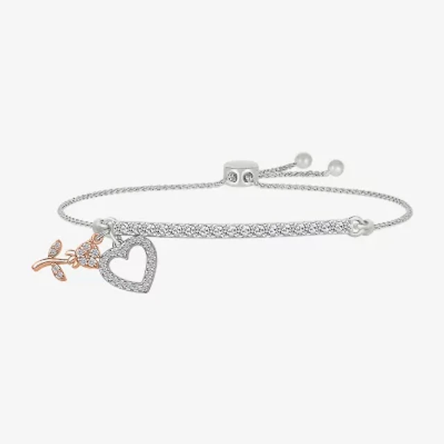 Womens Lab Created White Sapphire 10K Rose Gold Sterling Silver Heart Bolo Bracelet