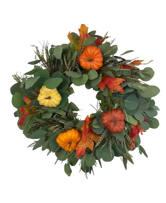 GreenishBlu Silver-tone Eucalyptus, Grevillia and Pumpkins Fresh Fall Wreath