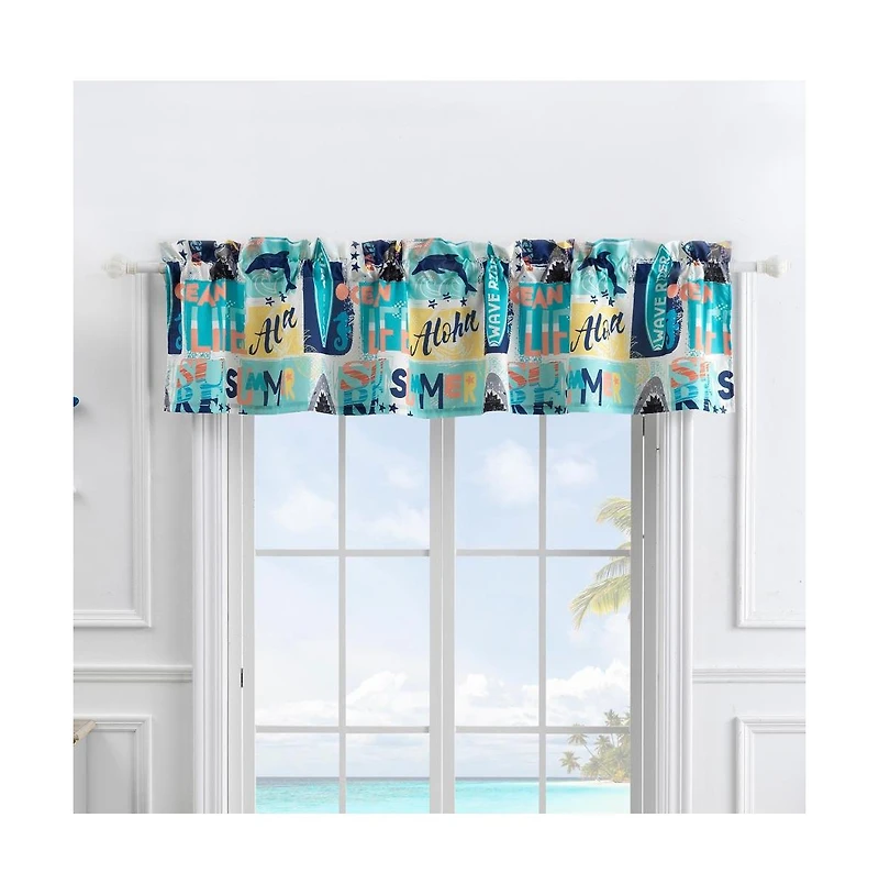 When you have to crash, do it on the beach! The Wave Rider window valance brings big wave surf adventures home. Summer fun beach art in shades of blue and gray dominate the scene with colorful pops of warm yellow and coral. Lined with a solid color liner for increased privacy and protection from the sun, each valance is made from 100% brushed microfiber polyester. Three-inch rod pocket along the top fits most rods for hanging. Drop length is 16 inches, plus two inches of header fabric above the rod pocket make the valance 18 inches tall from top to bottom. A full 84 inches wide, this valance will fit even very large windows Machine washable.