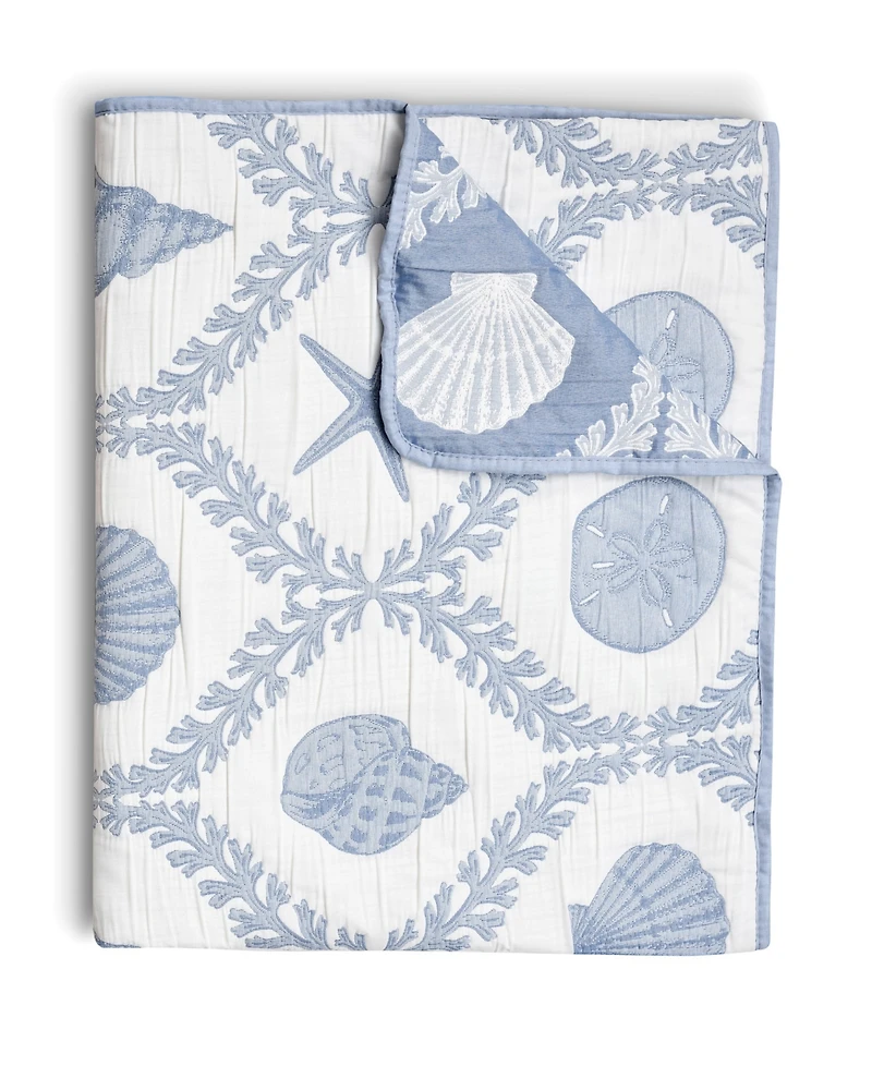 Inspired by the quiet beauty of tidepools and sandy morning walks, our Laguna collection celebrates the treasures of the sea. An intricate ogee layout frames delicate seashells, sand dollars, and sea stars rendered in soft blue-and-white yarns. The result is a rich, dimensional woven design that feels both peaceful and timeless.