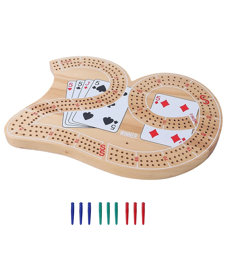 The 29 cribbage board game set includes a solid wood cribbage board, 9 colored plastic pegs (3 red /3 blue /3 green), and game instructions. The cribbage board bottom has a slot channel for storage pegs while maintaining a seamless design, designed with a ""finish hole"" for the first-place finishing player, used for games played to 61 or 121 points. Design inspired by the perfect 29 hand cribbage score, a 1 in 216, 580 change in two player games! The three-track colored cribbage board is designed for 2-3 players, great for family fun, traveling, gatherings, parties and game nights with friends.