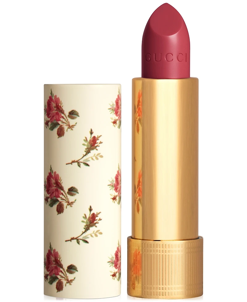 Kissing the lips with color like a memory, the Gucci Rouge a Levres Voile Lipstick's sheer formula gives lips a luminous finish in a range of vibrant shades that deliver moisture and comfort in a lightweight texture. Enriched with oils and waxes for a creamy and soft formula, this Gucci lipstick glides on easily with an optimal release of pure color, leaving lips hydrated all day. The range of bright shades is inspired by iconic Hollywood films and characters from the Golden Age. The vintage-inspired makeup packaging blends the House's motifs with contemporary icons. Rouge a Levres Voile Lipstick makes a feminine statement with a pink rosebud print on ivory and a golden base, like something found on a 1940s dressing table.