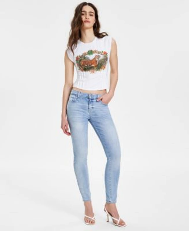Guess Womens Sleeveless Tiger Graphic Corset T Shirt Mid Rise Sexy Curve Skinny Jeans