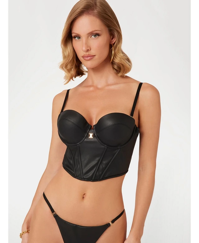 Womens Faux Leather Tie Strap Cropped Bustier Top, Black, Size S
