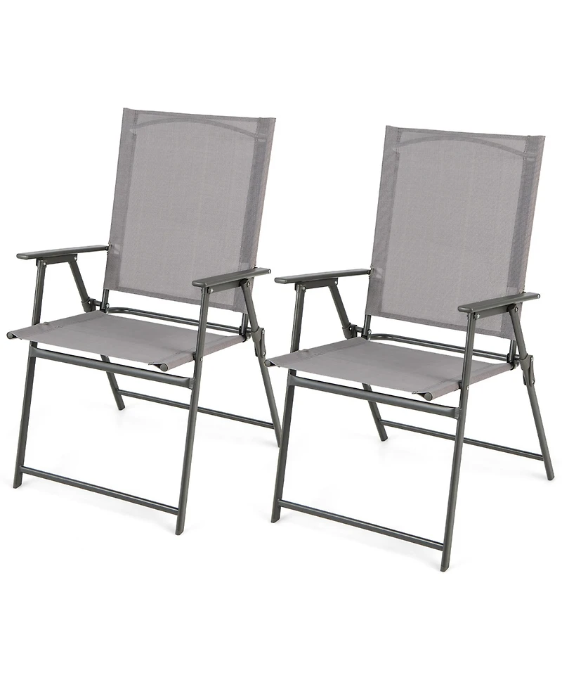 Enjoy the convenience of unfolding and folding with our set of 2 outdoor patio chairs! These folding chairs are designed for comfort, featuring high backrests, cozy armrests, and deep seats. The breathable and quick-drying fabric adds an extra layer of comfort, allowing you to relax for hours on end. The sturdy, anti-rust metal frames and security locks provide stability and safety while seated. Folding these chairs is a breeze simply lift the security locks for easy storage.Features:Sturdy and anti-rust metal frame supports up to 330 lbsNon-slip foot pads for stability and floor protectionFolding design for easy storage and space-saving