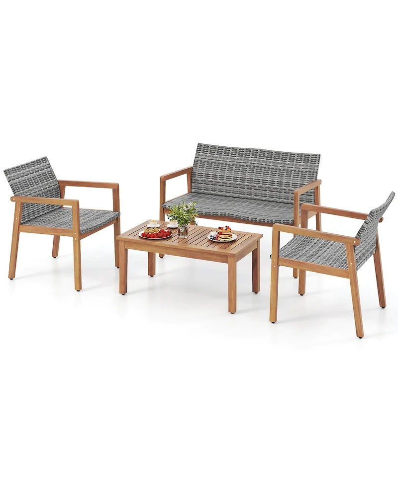 Gymax 4 Pieces Outdoor Furniture Set Acacia Wood Frame Sofa Set w/ Rattan Seat