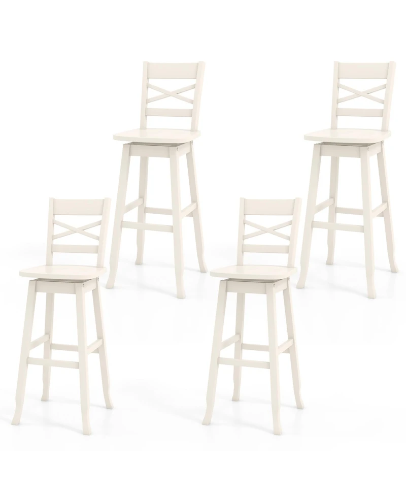Indulge in comfort and elegance with this set of 4 bar height stools. The ergonomic design features a slightly inclined backrest and a W-shaped concave seat for maximum support during extended sitting. The bar stools are equipped with a sturdy metal base that swivels 360degree(s), allowing for unrestricted movement during conversations. Customize your sitting position with the thoughtful footrest, which complements the 30'' seat height with a 3'' high footrest to reduce fatigue during gatherings. Constructed from rubber wood, these bar stools offer unwavering stability, reinforced by additional crossbars. Features: Choose from painted rubber wood for a solid, and Sturdy material. Cozy inclined backrest and curved seating surface for exceptional comfort. Ergonomic footrest allows for leg stretching and relaxation