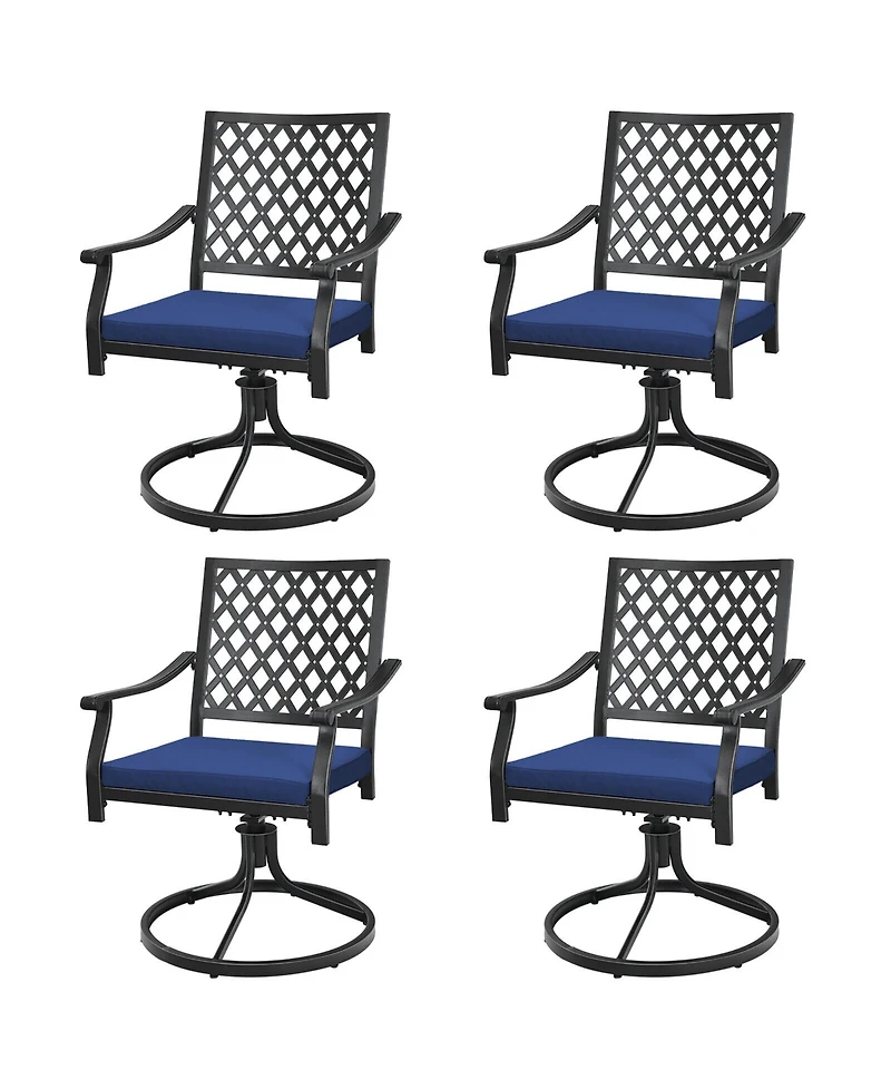 Our 4pcs patio swivel chair is perfectly designed for your outdoor relaxation. Exquisite swiveling design provides much convenience for you to fetch things and talk with others. And you can enjoy the gentle rocking to relieve your fatigue and stress. You can use the seat cushion or not based on your preference and it will offer you a more comfortable sitting experience with curved armrests and high backrest. Furthermore, the main frame is made of anti-rust and super sturdy steel, ensuring the long-lasting service life and strong weight capacity which is up to 350 lbs. Also, the chair set is of good appearance with appealing patterns. It will be a good choice for you to relax with our patio swivel dining chairs.Features:360-degree rotated seat helps you easily take things or talk with othersRocking function makes you feel more relaxedHigh-density seat cushion provides more comfort