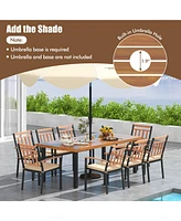 Enjoy a blend of style, comfort, and practicality with our 9-piece patio acacia wood dining set.Expertly crafted from high-quality acacia wood and a sturdy metal frame, our outdoor dining set offers not only durability but also an elegant enhancement to any space. The soft cushions offer sublime seating comfort while the 1.9'' umbrella hole in our spaciously designed table ensures you enjoy your gatherings shaded from the sun. The space-saving design allows for compact storage, making this outdoor table and chairs set an ideal choice for gardens, decks and backyards.Features:High-quality acacia wood for high strength and natural beautySplinter-free surface for a smooth touch and easy maintenanceEnsure stable and reliable support with a heavy-duty metal frame