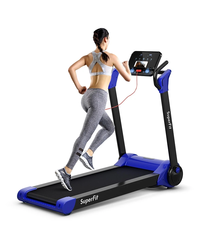 This premium treadmill is suitable for office, gym and home use to help have a healthy body. Built-in powerful 2.25HP motor helps you thoroughly workout your body. The 5-layer non-slip running belt will greatly absorb shock to protect your knee, muscle and joints. Superior load-bearing capacity and the wide running area are safe for you to exercise. You can connect the treadmill to your phone through Bluetooth and play music while you are exercising. It is equipped with a safety key for immediate closure in an emergency. 4 transport wheels together with the folding design will help you move or store it in a small place. Start exercising now!Features:Use the phone holder to watch videos or chat with friends while runningConnect the treadmill to electronics through Bluetooth to enjoy musicBuilt-in 2.25HP motor provides high intensity exerciseLED display monitor your exercise data in real time