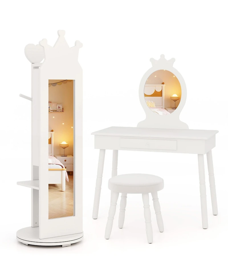 Delight your little princess with our vanity set with jewelry armoire cabinet!The top crown shape will appeal to your child. The full-length mirror brings your little one a head-to-toe view. With makeup mirror, kids can clearly see their faces in all directions. The jewelry armoire cabinet and coat rack combo is also equipped with 35 ring slots, 3 storage shelves, 2 hanging hooks and 2 bottom storage shelves. Meanwhile, kids can also store their jewelry, nail polishes, and toys in the drawer of the dressing table. The stool provides kids with a resting place. 360° swivel base makes the storage cabinet easy to rotate. To keep it safe and sturdy, there are anti-toppling devicesFeatures:Abundant storage space for kids to store their itemsFixing wooden dowel for added convenienceEasy and quick to assemble