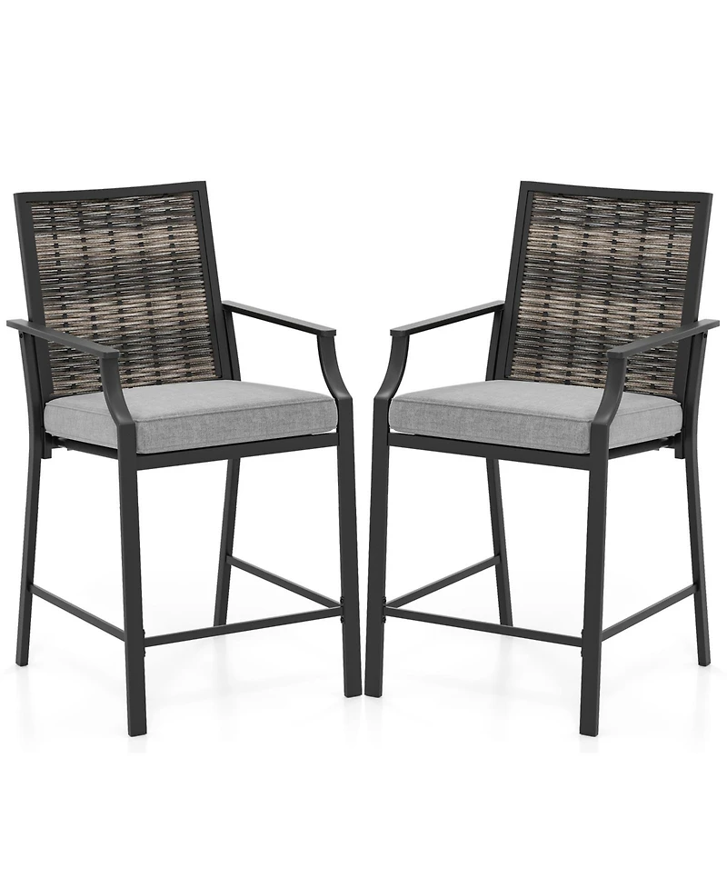 Enjoy comfort and relaxation with these patio rattan bar chairs, a superb blend of functionality and style. These counter height stools are intricately crafted from elegant rattan that not only looks attractive but is built to last. Each barstool comes with a removable cushion, secured by hook and loop fasteners or can be used without for a breathable seat. The ergonomically designed backrest and sturdy footrests ensure maximum comfort. Moreover, the robust metal frame supports up to 330 lbs and maintains stability with non-slip footpads. Whether hosting a sunset gathering or enjoying a quiet afternoon by the pool, these bar chairs with well-crafted details are the perfect addition for any occasion, offering a unique touch of elegance and superior durability.Features:Well-woven rattan back for elegance and durabilityUse with cushion to enjoy more softness and comfortSeat fabric is breathable to sit in hot weather