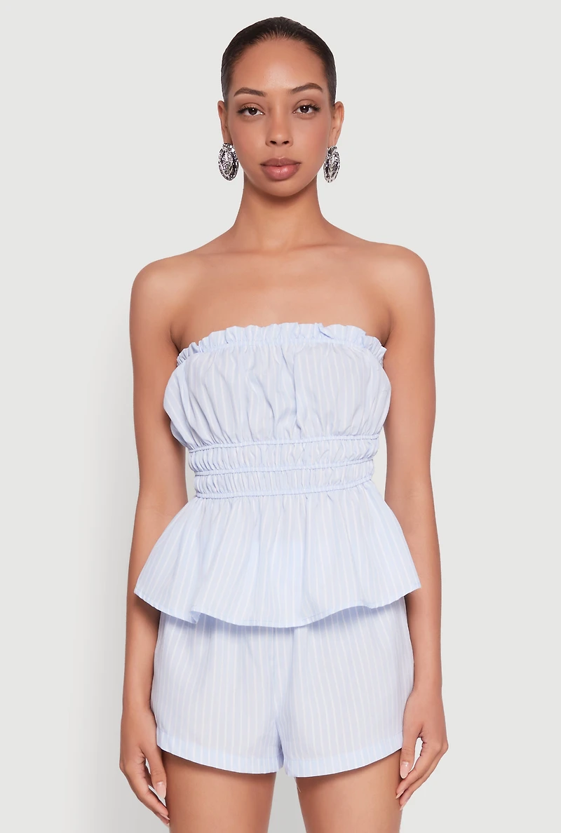 Step out in style with the Haute Monde Smocked Pinstripe Peplum Top, the perfect blend of chic and comfort for your everyday looks. Its classic fit and timeless silhouette make it a versatile addition to any wardrobe, while the strapless design and sleeveless cut keep you feeling cool and confident. Whether you're dressing up for a brunch date or adding a flirty touch to your casual outfit, this top is your new go-to for effortless fashion.