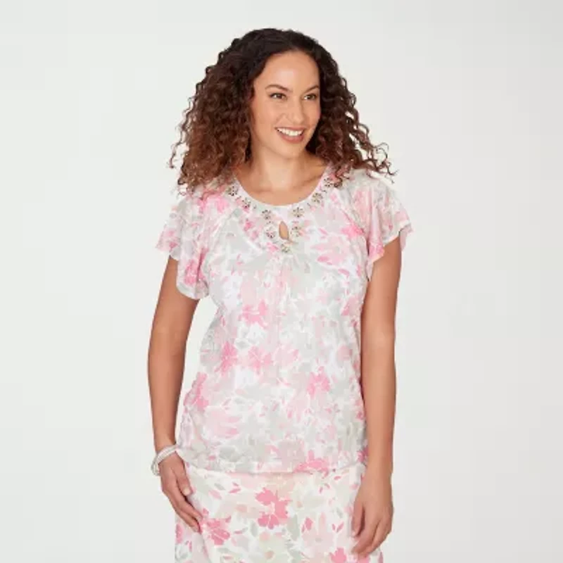Elevate your style with this floral print knit burnout top featuring flutter sleeves, a keyhole neckline, and delicate embellishments for a feminine, effortless look