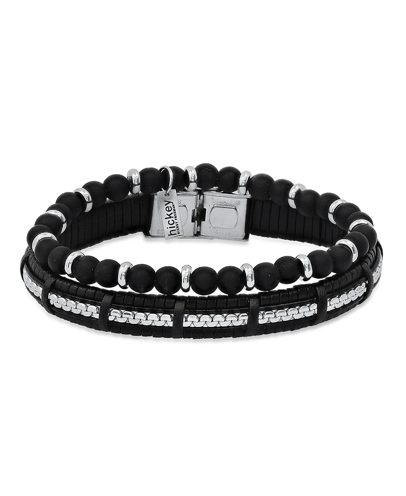 Set of two bracelets with genuine black leather- wrapped band bracelet with sectioned stainless steel rounded box chain inlay smooth black lava beaded stretch bracelet with stainless steel accent beads.