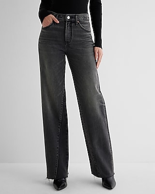 High Waisted Washed Black Raw Hem Wide Leg Jeans