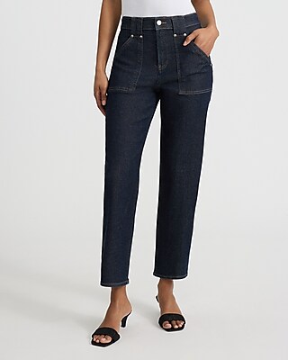 High Waisted Dark Wash Patch Pocket Straight Ankle Jeans